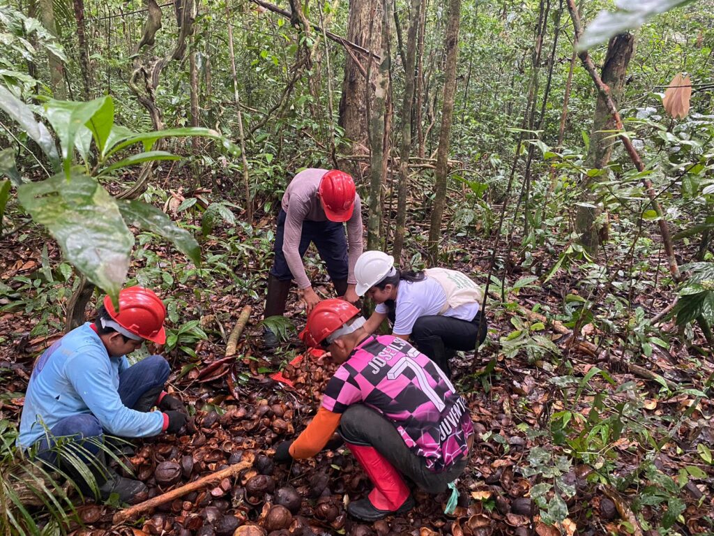 Em campo, o grupo se divide para ampliar a área de recolhimento dos frutos caídos no chão, com o cuidado de manter pelo menos 30% deles na floresta, para que germinem e novas árvores possam crescer.
