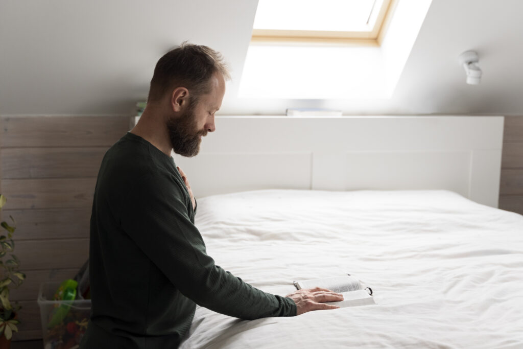 Homem fazendo oração próximo a cama. Reprodução/Freepik