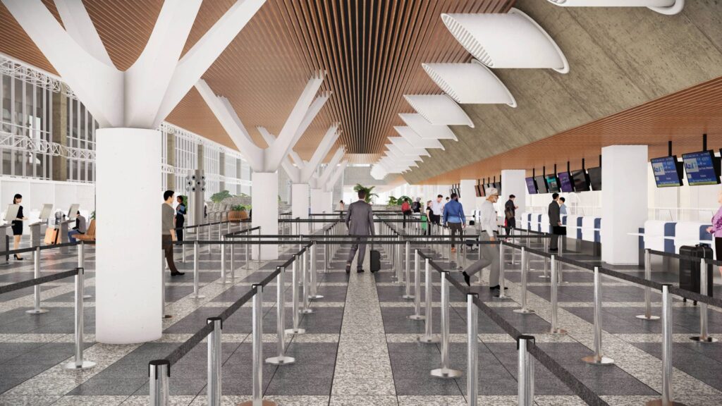 “Por meio da criação de dois novos mezaninos no saguão principal, o espaço será ampliado para 3.380 m², possibilitando benefícios que vão desde o processo de inspeção de segurança até a espera pelo voo, com a disponibilidade de uma nova praça de alimentação e a modernização dos sistemas de climatização, iluminação e abastecimento elétrico, que será realizado por fontes 100% renováveis”, destaca a empresa.