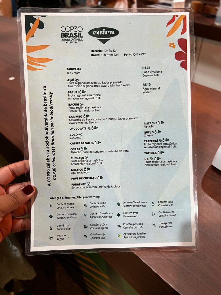 Cardápio com os 17 sabores de sorvetes da Cairu disponíveis nos espaços da COP30. Tereza Coelho/Pará Terra Boa