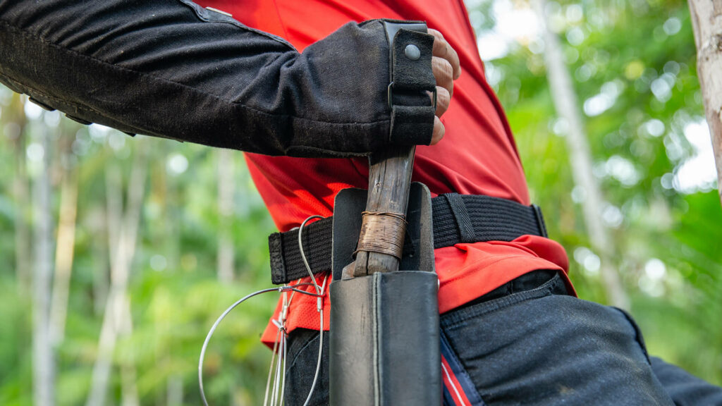 Não é necessário grande esforço de imaginação para entender os múltiplos riscos daqueles que sobem em finas palmeiras até 20 metros de altura, com facões sem bainha na costa, sem vestimentas adequadas e com o uso de um único acessório para a escalada, a peconha.