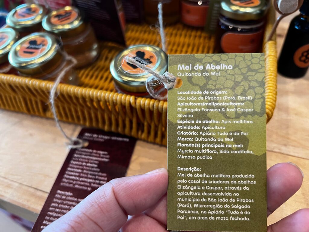 A rastreabilidade e a transparência são garantidas por cartões informativos que acompanham cada produto, independentemente do volume. Esses registros detalham se o manejo provém da apicultura (abelhas com ferrão) ou da meliponicultura (abelhas nativas sem ferrão), identificando a espécie responsável, o perfil dos criadores e a origem botânica do mel. Essa abordagem estabelece uma conexão direta entre a biodiversidade local, as técnicas de manejo e as notas sensoriais do alimento.