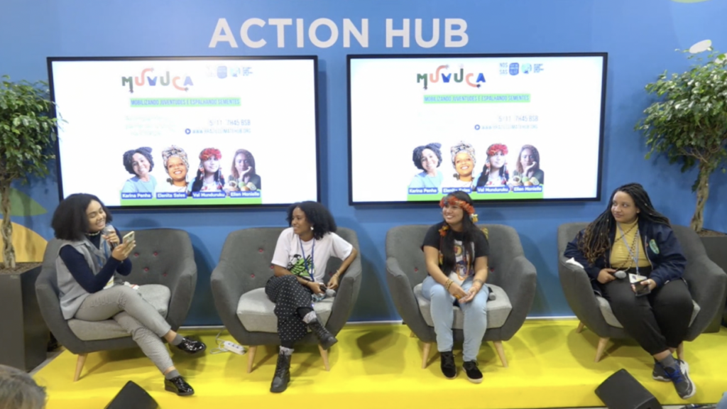 Pensar neste futuro justo também é um grande desafio para jovens ativistas que marcaram presença nesta sexta-feira, 5/11, na 26ª edição da COP, que ocorre até o dia 12 de novembro, em Glasgow, na Escócia, durante a apresentação do MUVUCA – programa de ativismo climático realizado pelo NOSSAS com 35 jovens ativistas do clima. Elas foram convidadas do Brazil Climate Action Hub, grupo criado em 2019 por diversas organizações da sociedade civil brasileira para dar visibilidade à ação climática brasileira durante a COP25, realizada em Madri, na Espanha.