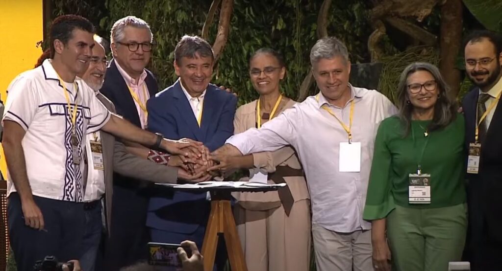 A ministra Marina Silva (Meio Ambiente) e os ministros Wellington Dias (Desenvolvimento Social), Alexandre Padilha (Relações Institucionais), Jader Filho (Cidades) e Paulo Teixeira (Desenvolvimento Agrário), além do governados do Pará, Helder Barbalho, e do prefeito de Belém, Edmilson Rodrigues, estão presentes.