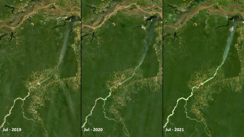 Pluma de sedimentos no Tapajós em julho de 2019, 2020 e 2021 (Imagem: MapBiomas)