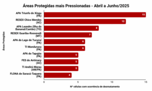 Além do ranking apenas das terras indígenas, o relatório também mostra a classificação geral das áreas protegidas mais pressionadas e ameaçadas pelo desmatamento na Amazônia, que inclui as unidades de conservação estaduais e federais. Nessa lista, a liderança entre os territórios protegidos com mais ocorrências de devastação dentro de seus limites foi da APA Triunfo do Xingu, no Pará. Outras cinco áreas protegidas paraenses também estão nesse ranking, o que deixou o estado com seis dos 10 territórios mais pressionados da Amazônia.